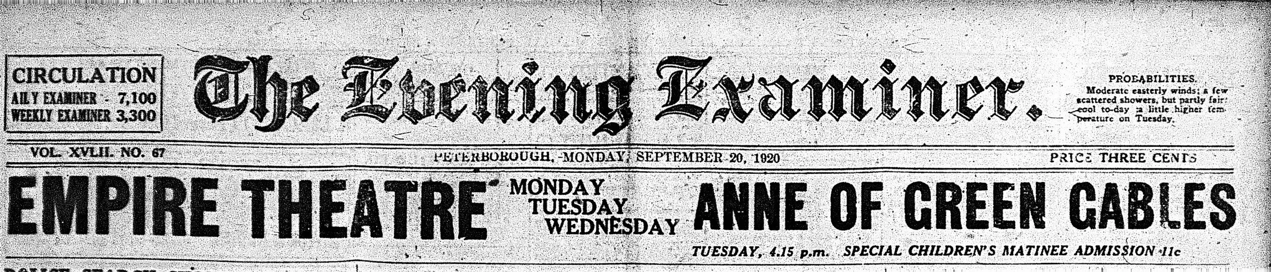 In 1920 the theatre made a big splash with its showing of the film version of the Canadian classic (but U.S. film) Anne of Green Gables (1919), starring Mary Miles Minter (with its exterior scenes filmed in Dedham, Mass.). The Empire’s screening of Experimental Marriage and other films especially stands out.